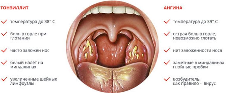 Ангина сопровождается гнойным или белым налетом на поверхности языка, здесь не обойтись без антибиотиков.