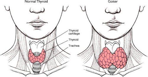 | Объективные изменения | В зависимости от степени разрастания органа, может быть как утолщение шеи, так и увеличение железы, определяемое только пальпаторно | Любые объективные изменения отсутствуют | При осмотре пациента признаки заболевания отсутствуют |