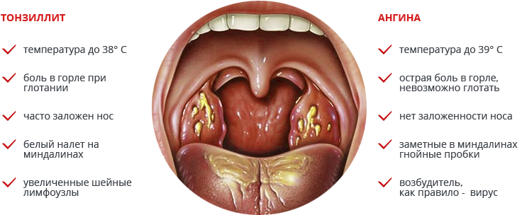 | Переохлаждение под дождем, непосредственный контакт с лихорадочным пациентом | Болевые ощущения в горле, высокая температура тела, боль при глотании | Увеличение миндалин, наблюдаются сероватые или желтоватые пузырьки в углублениях | ЛОР заболевания, инфекционные болезни | Прием антибиотиков