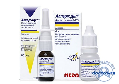 Азеластин. Включён в противоаллергические капли - Аллергодил и Азеластин. Они вляются средствами второго поколения с минимальным проникновением компонентов в грудное молоко. Спреи показаны при насморке аллергического характера, но обладают выраженным местным действием и при инфекционном рините. Основным преимуществом является полная совместимость с грудным вскармливанием.